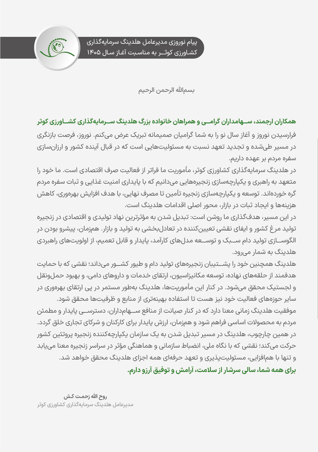 همکاران ارجمند، سهامداران گرامی و همراهان خانواده بزرگ هلدینگ سرمایهگذاری کشاورزی کوثر؛
