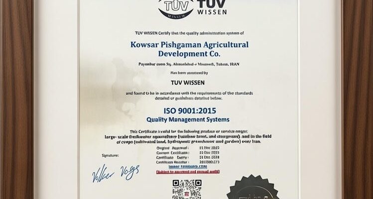 شرکت پیشگامان توسعه کشاورزی کوثر برای نخستین بار موفق به دریافت گواهینامه بینالمللی ISO 9001:2015 در حوزه سیستم مدیریت کیفیت شد؛ گواهینامهای معتبر که پس از ارزیابیهای تخصصی و ممیزیهای فنی توسط نهاد بینالمللی TÜV WISSEN صادر شده و بیانگر استقرار نظاممند رویکرد کیفیتمحور در فرآیندهای این شرکت است.