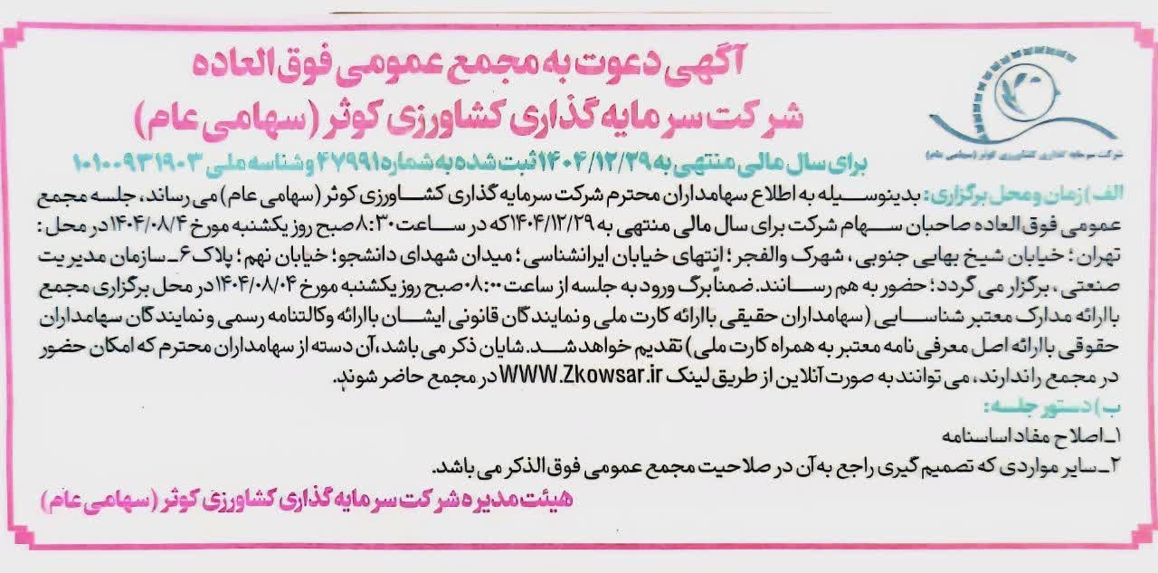 آگهی دعوت به مجمع عمومی فوقالعاده شرکت سرمایهگذاری کشاورزی کوثر (سهامی عام) به شماره ثبت ۴۷۹۹۱ و شناسه ...